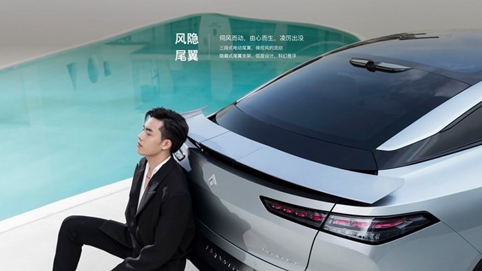 车身侧面采用了溜背式的轿跑风格设计,车身腰线贯穿至尾部,隐藏式的门把手搭配较为平整的车门,让新车的整体造型看上去干净利落。此外,新车还配备了五辐式的轮圈,并搭配了亮色的制动卡钳。车尾部,新车采用狭长的灯组设计,后包围则搭配了尾部扩散器装饰,进一步提升运动属性。